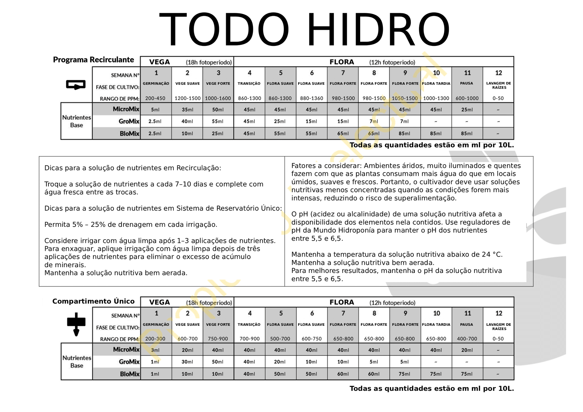 - Estes valores estão em gramas por 10 litros de água ou solução final.
